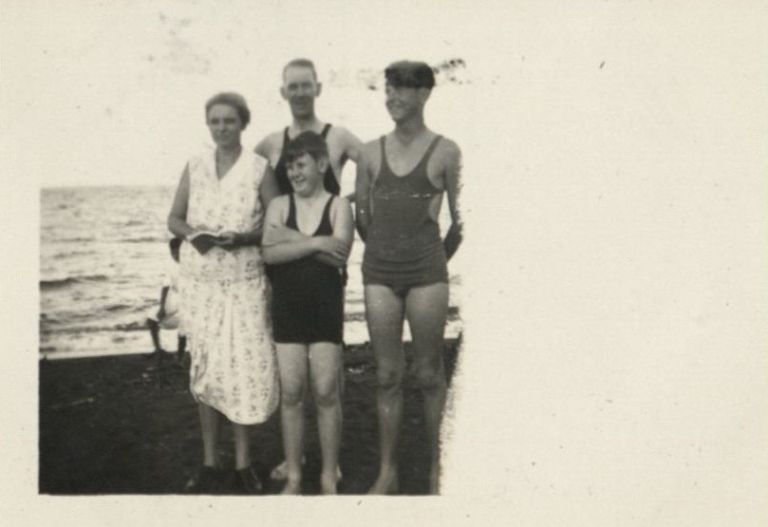 Mother [Hawkins], Dad [Harry Hawkins, Sr.], Bob [Hawkins], and Jim [Stapler] on the beach.