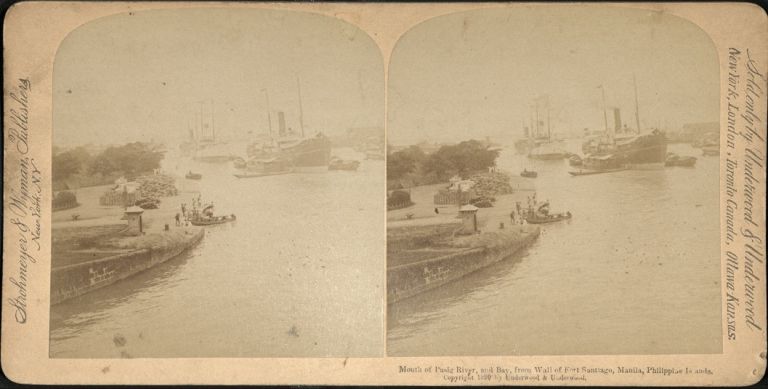 Underwood #U165. Ships in the channel, mouth of Pasig River; Fort Santiago on left.