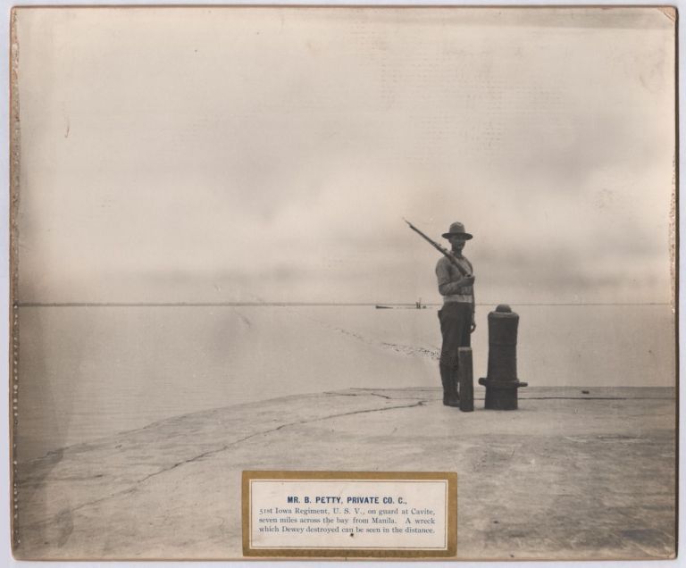 Standing guard duty at Fort San Felipe, Cavite. Full caption continues: "51st Iowa regiment, U.S.V., on guard at Cavite, seven miles across the bay from Manila. A wreck which Dewey destroyed can be seen in the distance."