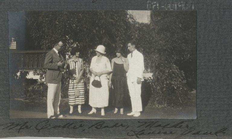 Subject: Five American or British tourists stand outside in a garden at the Raffles Hotel in Singapore.