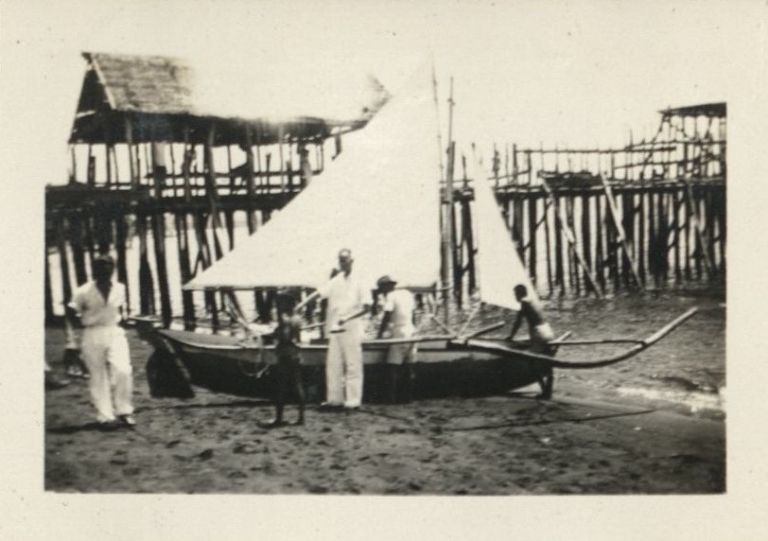 Subject: A sailing outrigger canoe on the beach in Albay Province, probably near Legaspi City, in front of a wooden pier. This sub-series of photos covers a trip Harry Jr. and Jim Stapler made from Ba