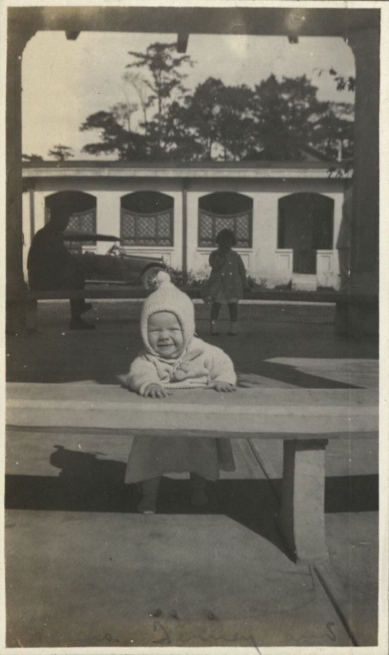 Subject: Mary Anne Denney learning to walk grabs a bench in a gazebo with another girl and a man in the shadows behind. At Baguio, and this is a military family, so perhaps this is at Camp John Hay.