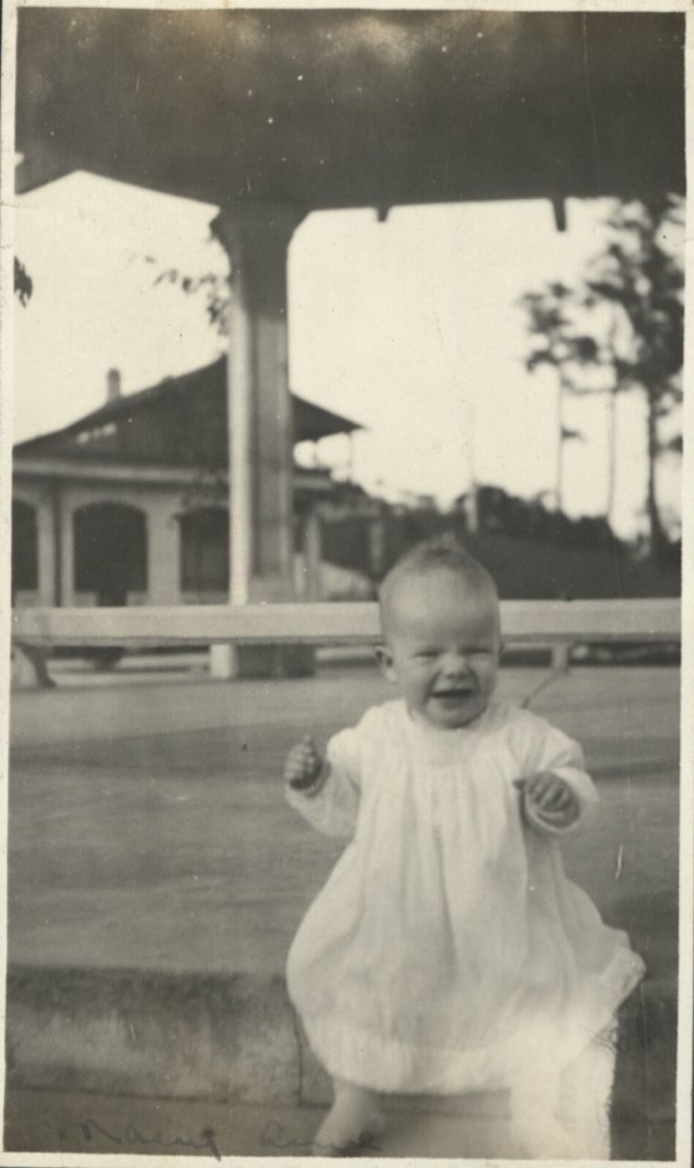 Subject: Mary Anne Denney learning to walk sits on a step of a gazebo. At Baguio, and this is a military family, so perhaps this is at Camp John Hay. See also OFI-004687-4690.