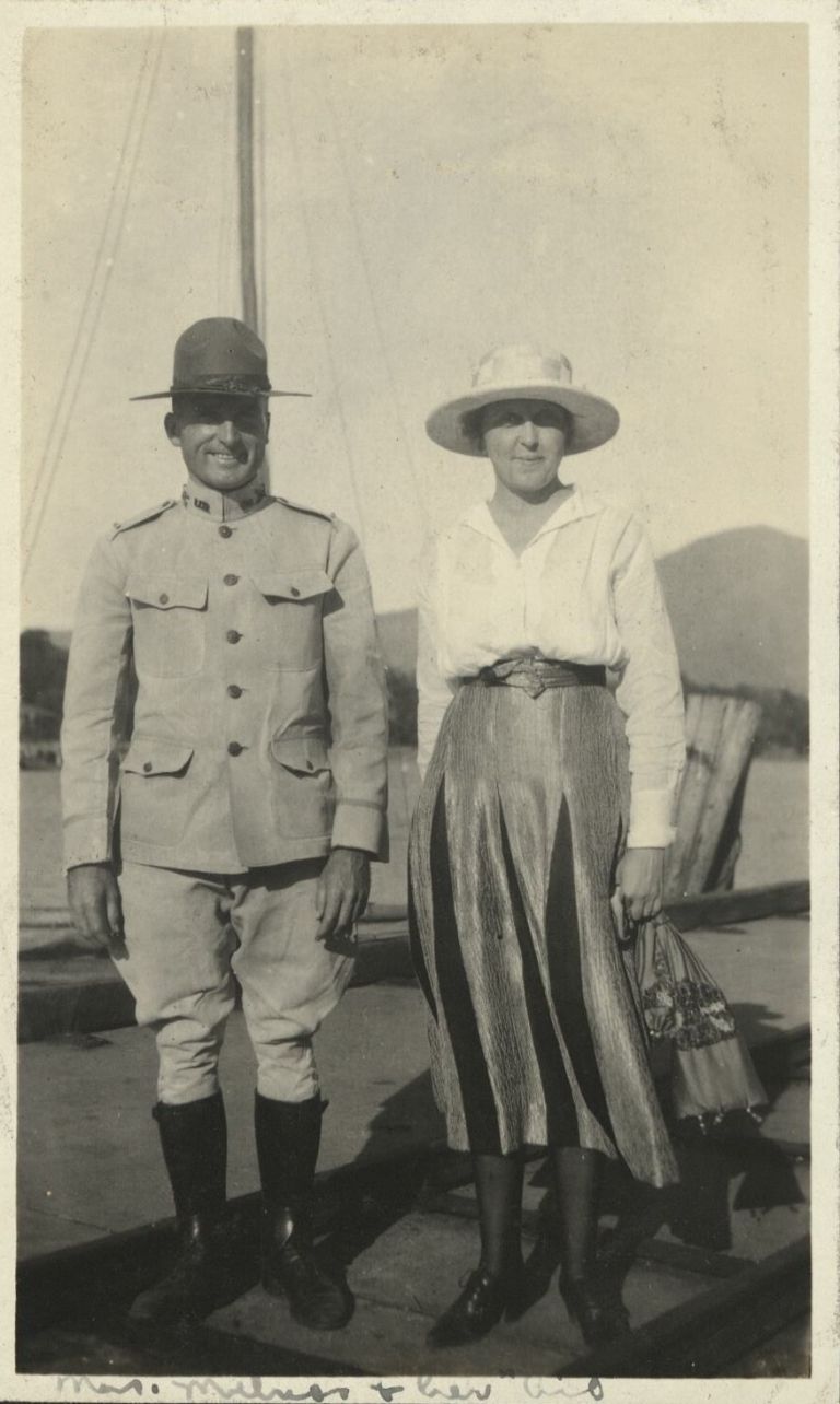 Subject: The man is likely the husband of the album's creator, the woman is Mrs. Milner, the "Aio" is unidentified, but may refer to the drawstring bag she is holding. Today "AIO" is abbreviation for