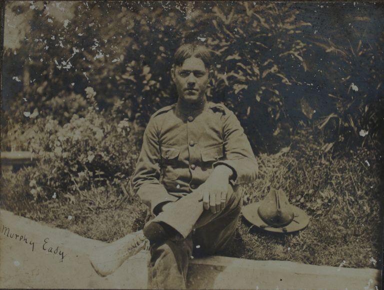 Subject: U.S. soldier sits on a garden wall in uniform. There is a Murphy Eady mentioned in the San Francisco "Call" (newspaper) on August 13, 1899, and one who died in Tennessee on Novembe