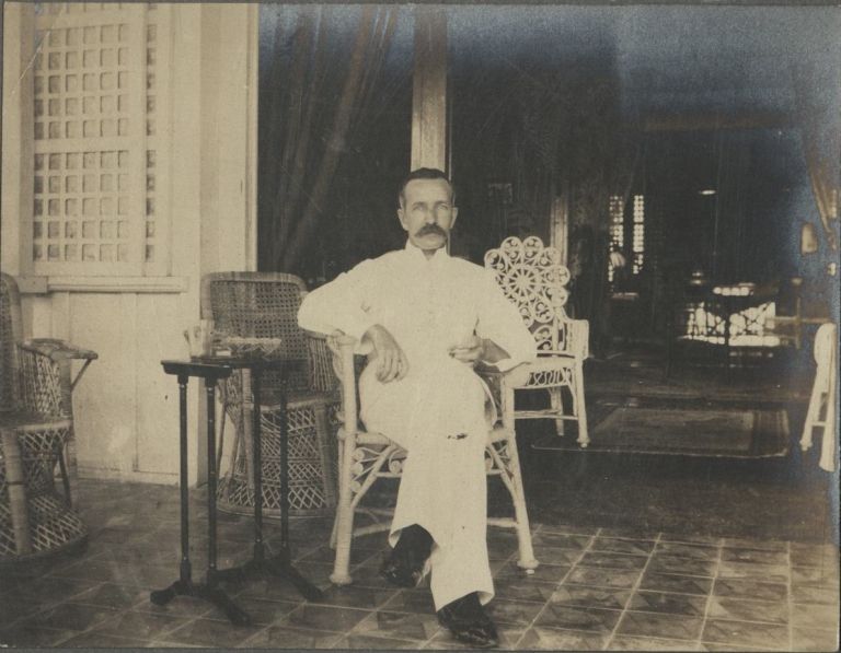 Subject: An expatriate man dressed in a tropical white suit relaxs in a wicker chair on a patio opening off a sala.