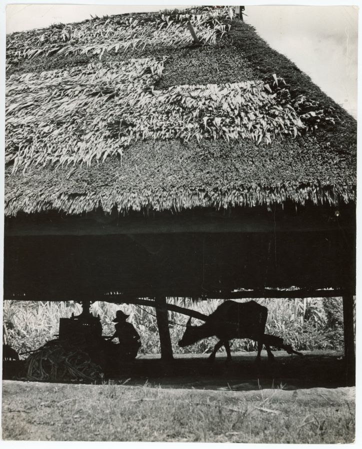 Man and carabao operate a sugarcane crushing operation in Zamboanga. "Muscovado" is a type of partially refined to unrefined brown sugar with a strong molasses content and flavor. Full caption "Muscavado Mill, Zamboanga, Philippines. The sane stalks are crushed between two cast iron rollers which are run by a blindfolded carabao walking round and round."