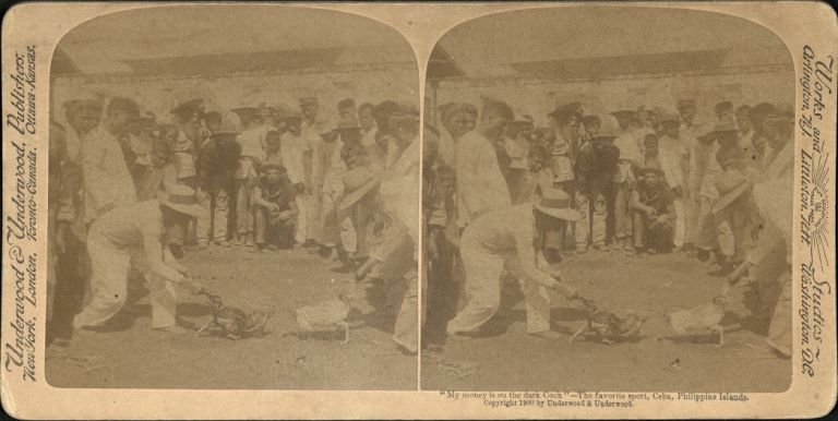 Underwood #U605b. Group of men circle around two fighting cocks held by their tails before a fight.