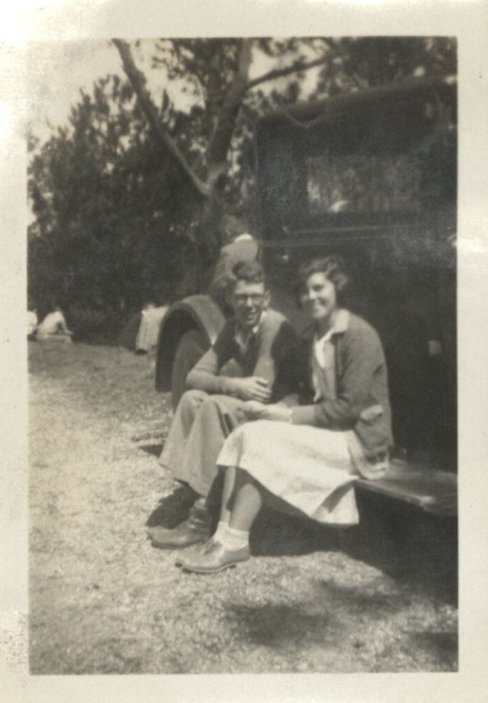Subject: Harry Hawkins Jr. and probably Nathelle "Sis" Laing (rather than Harry's sister Isabel Hawkins) sit on the running board of an automobile by "The Bank" at Brent School. See Halsema, James J.