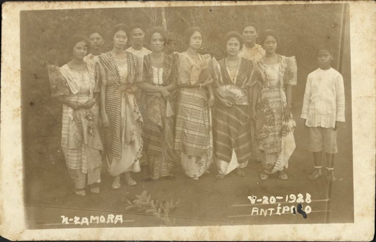 Subject: Group of 10 unidentified Filipino men and women in traditional dress stand outdoors in Antipolo.