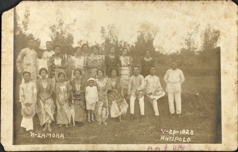 Subject: Group of 20 unidentified Filipino men and women in traditional dress pose standing and sitting outdoors in Antipolo.