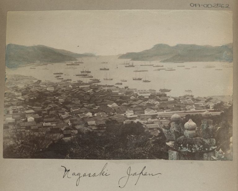 Subject: View from the hills looking down on houses and buildings in Nagasaki with boats and ships anchored in the harbor. U.S. troop transports typically also called at Tokyo, Na