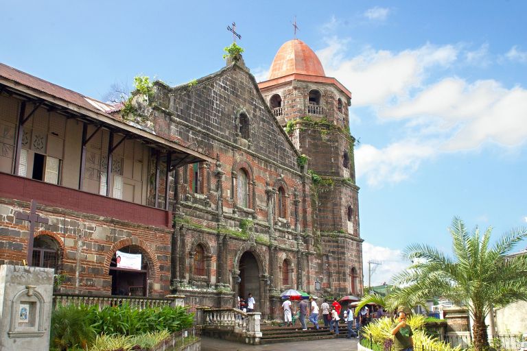Subject: Facade and bell tower of San Bartolome Apostol Parish Church, also known as Nagcarlan Church, in Nagcarlan, Laguna Province. Nagcarlan was first colonized in 1571 by Juan de Salcedo, grandson