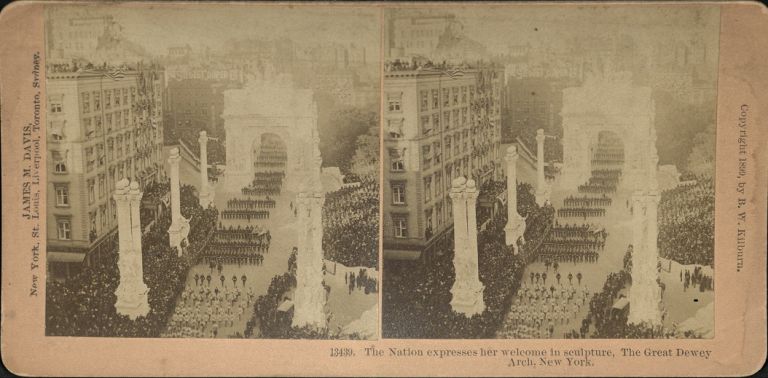Kilburn #B13439. View of ornate white columns and arch during parade in New York City commemorating Admiral Dewey's victory in the Philippines.