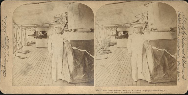 Underwoood #U650. Admiral Dewey U.S. naval commander during the Battle of Manila Bay, poses on deck of warship "Olympia."