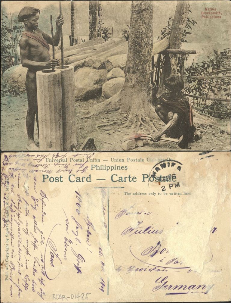 Subject: Indigenous man pounds metal axe head while another man stands with rods in hollowed tubes used as a forge, a type of hearth used for heating metals. See als