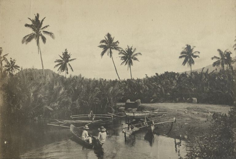 Subject: Native outrigger canoes at a landing on a small river by a stone bridge. Coconut palms and possibly nipa palms or oil palms compose the landscape, with possibly the shoulder of Mayon Volcano