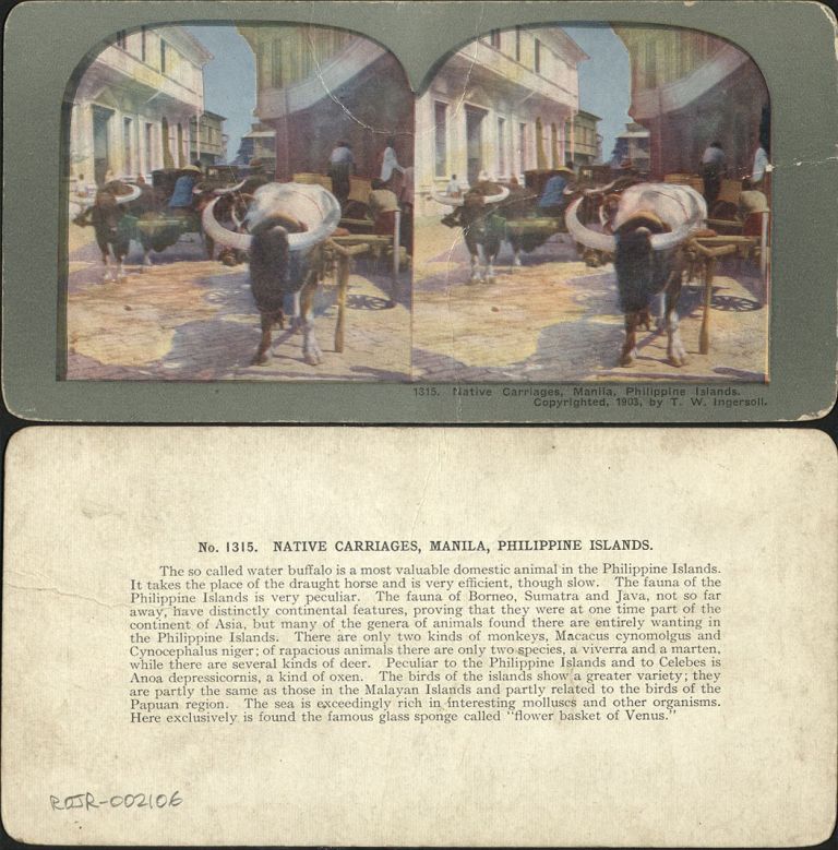 Ingersoll #IN1315. Three carabo pulling carts in the streets of Manila, Philippines.