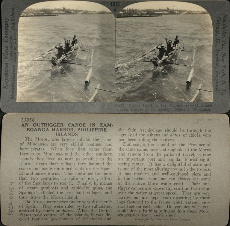 Keystone #K33956. Three men in a dugout outrigger canoe wave at the camera in Zamboanga, Philippines.
