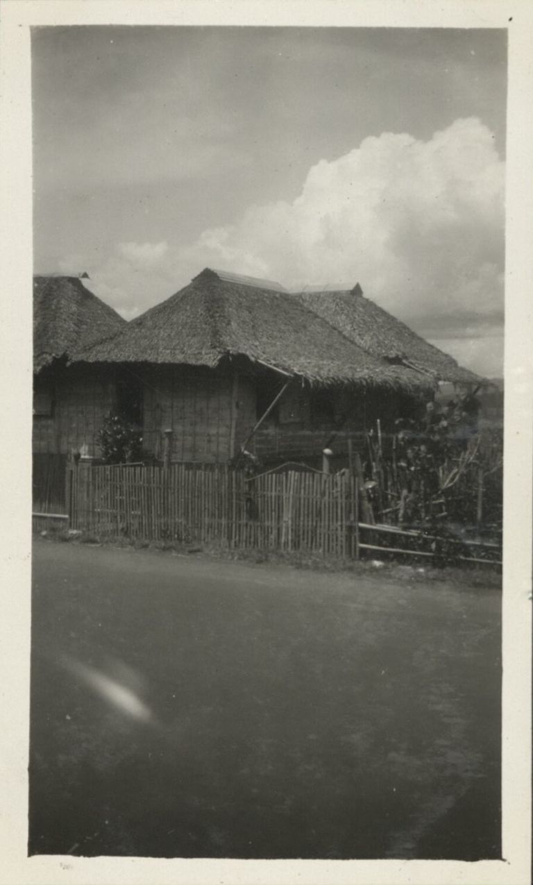 Subject: Small nipa huts line a roadway in the Philippines. A bay or lake appears in the background.
