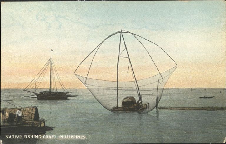 Subject: Fishing boats on water near shore, center boat has a large seine net raised.