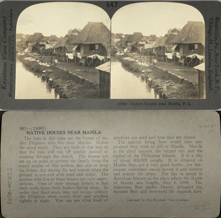 Keystone #K24080. Filipinos wash laundry in river across road from series of elevated, nipa-roofed houses.