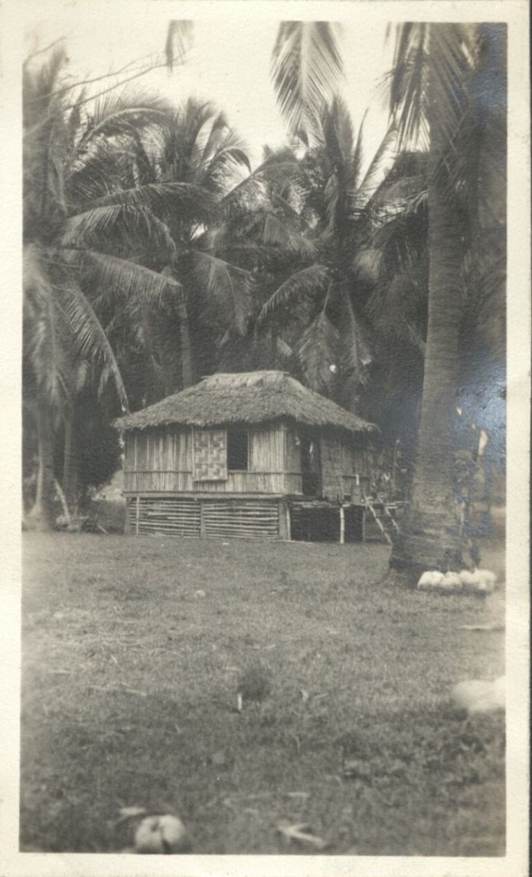 Subject: A nipa hut sits in a clearing surrounded by coconut palms.