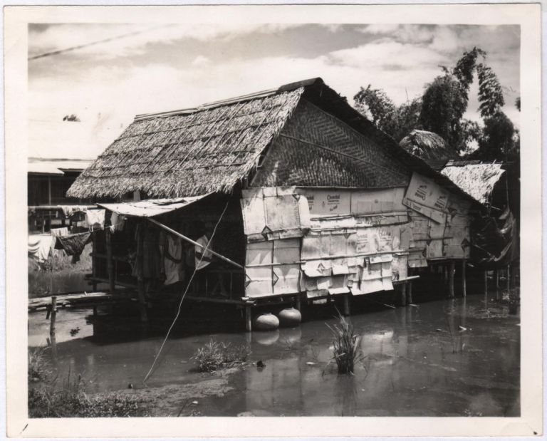 This hut or shack in a flooded area of Pampanga has flattened cardboard boxes for walls. The open front facing the road makes this likely a small store or restaurant. Images in this album are from an American soldier in the U.S. Army 13th Air Force stationed at Clark Field.