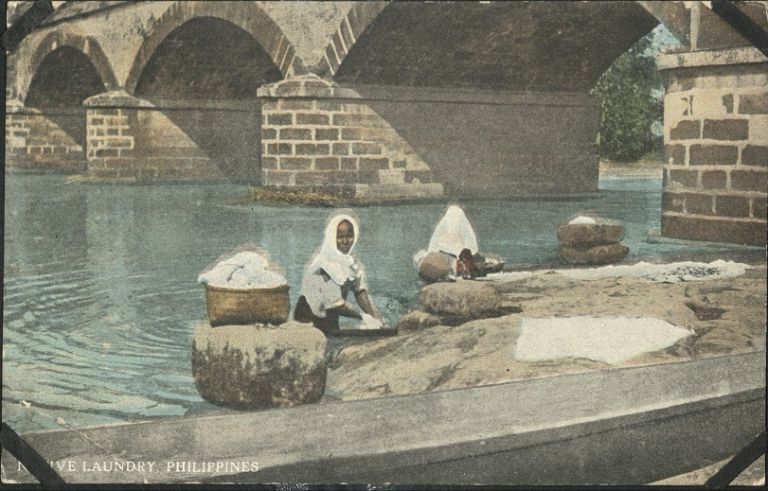 Subject: Women washing clothes in a Philippine river beneath an arched stone bridge.