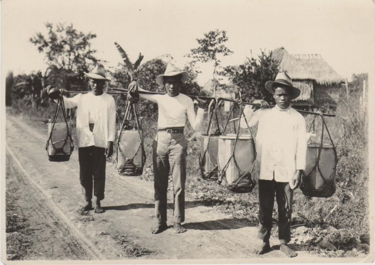 Subject: Filipino men pause while carrying milk from shoulder poles on a street. See also OFI-003171 for a similar view.