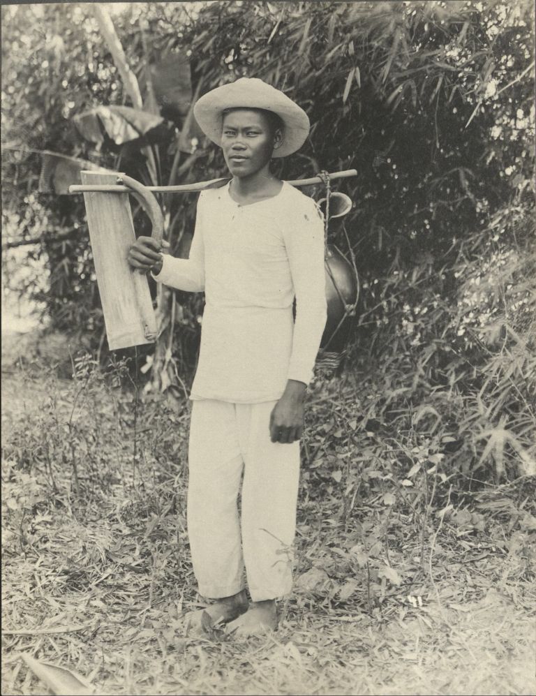 Subject: Filipino man carrying flasks of milk on bamboo shoulder pole stands before bamboo.
