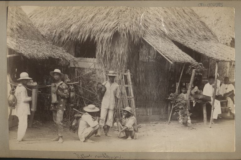 Subject: Filipino men carrying flasks of milk on bamboo shoulder poles before nipa huts. See also ROJR-001055 for same image in a postcard format. Lieut. Munson M. Z. Guthrie was an officer in Compa