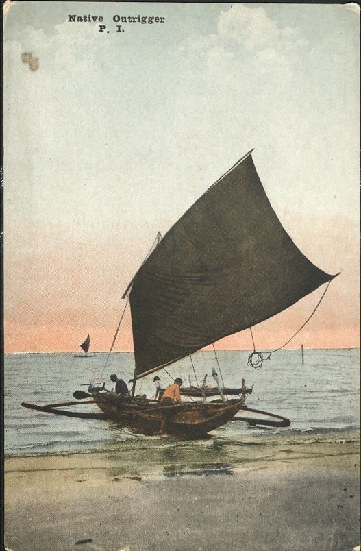 Subject: Three men in sailing outrigger pulled up on beach at Manila Bay; another boat far distance.