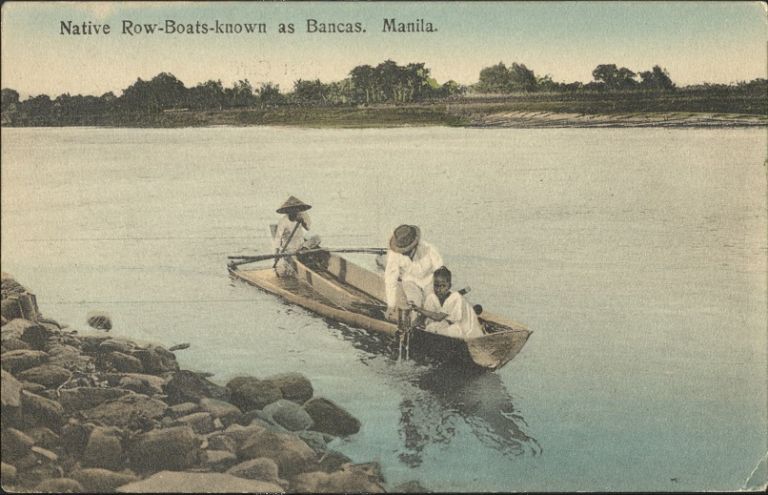 Subject: Three people in boat, likely a ferry, near rocky shore; far riverbank in distance.