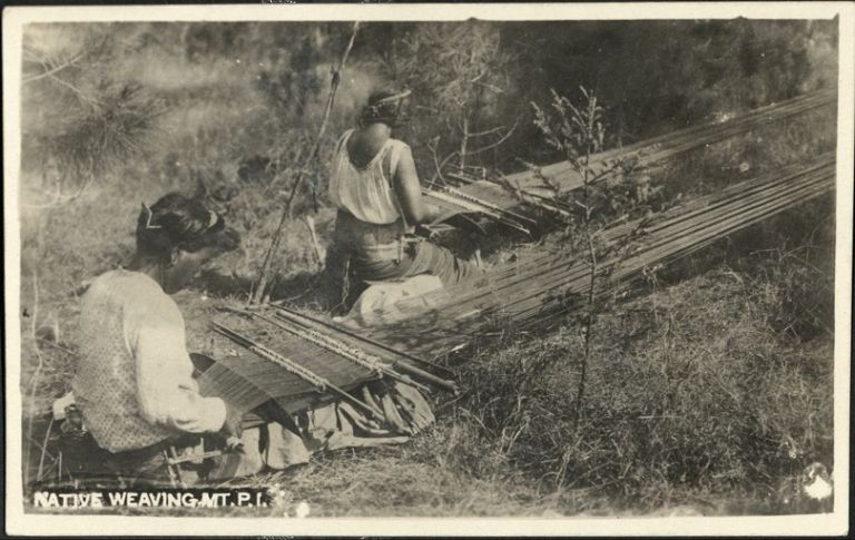 Subject: Two Igorot women in Mountain Province using simple looms outdoors to weave fabric.