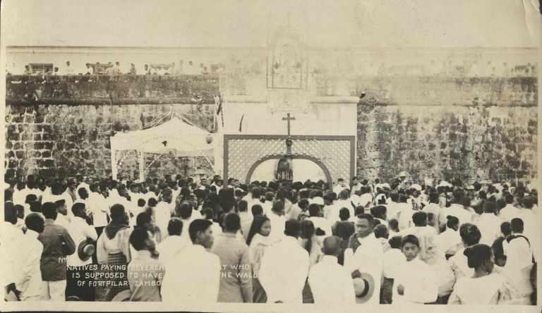 Natives paying reverence (illegible) who is supposed to have (illegible) the wall of Fort Pilar, Zamboanga.