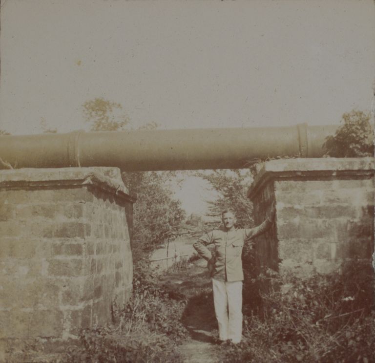 Subject: U.S. soldier poses next to supports for a water pipeline into Manila. This may be near the Marikina water works which served Manila - see OFI-003262 and OFI-003303 - which were the