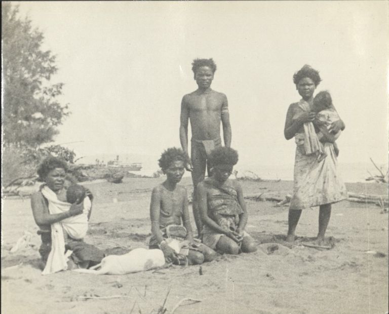Subject: An Aeta family in native dress on the seashore near Palanan Bay, Isabela Province. The Aeta are an indigenous people who live in scattered, isolated mountainous parts of Luzon. The Aeta were