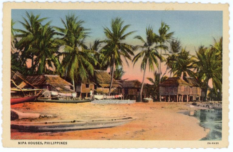 Boats on shore at low tide, cluster of nipa huts in distance among palm trees.
