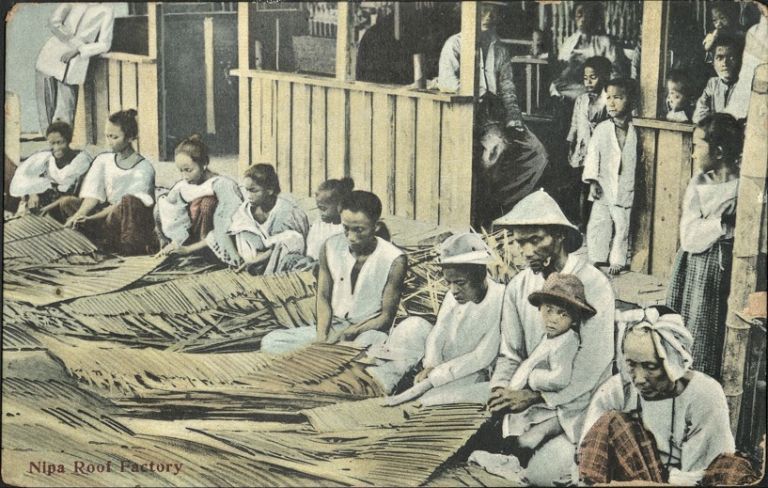 Subject: Men and women factory workers preparing nipa palm fronds for use as roofing.