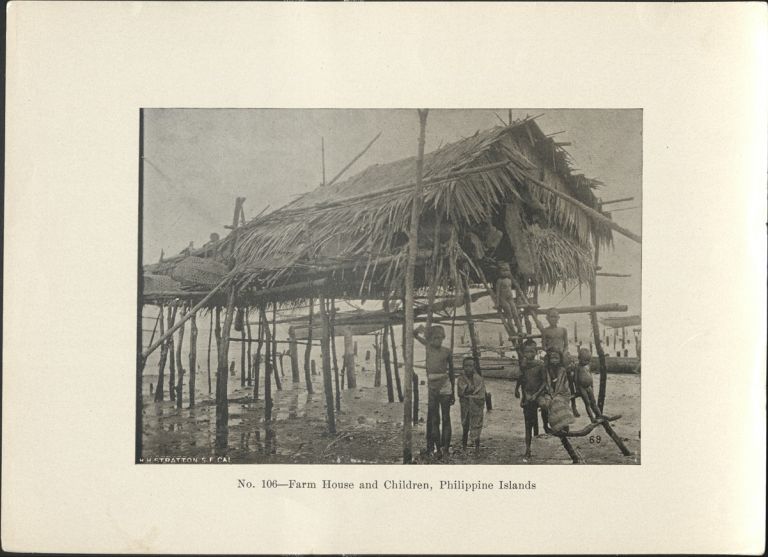 Subject: Group of Filipino children pose around a ladder up to a low-roofed hut on the seashore. Similarly to OFI-003358, it's curious why this is captioned a farm house when it is clearl