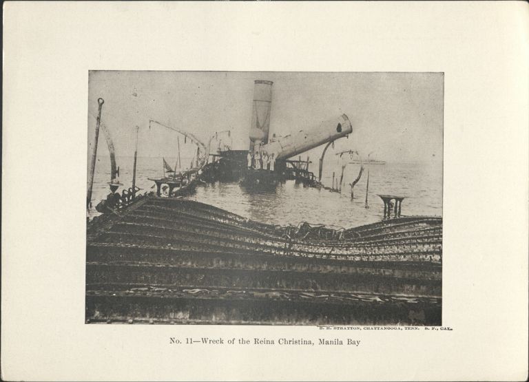 Subject: Spanish warship Reina Maria Christina lies sunken and destroyed in shallow water of Manila Bay. This image also appears as Givens (see OFI-003360) but here it is marked H. H. Stra