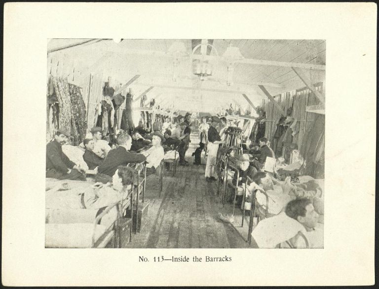 Subject: Off-duty U.S. soldiers relax in barracks by reading and visiting. It's unclear whether this photo was taken in Cuba, the Philippines, or the U.S.