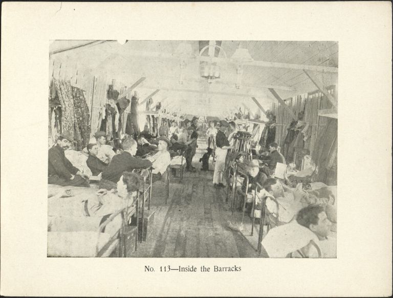 Subject: Off-duty U.S. soldiers relax in barracks by reading and visiting. It's unclear whether this photo was taken in Cuba, the Philippines, or the U.S.