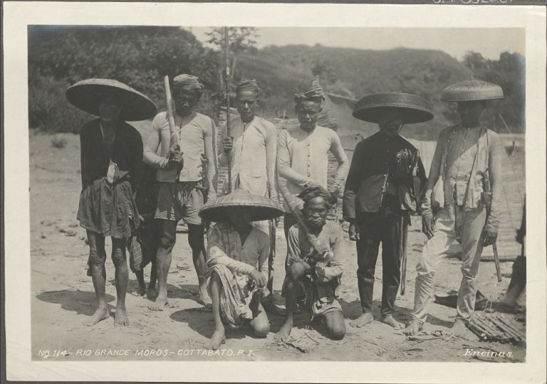 Subject: Group os Muslim Filipino men from along the Mindanao River in Cotabato Province or Cotabato City pose along the riverbank with spears and bolo knoves. The large woven hats are effective sun-b