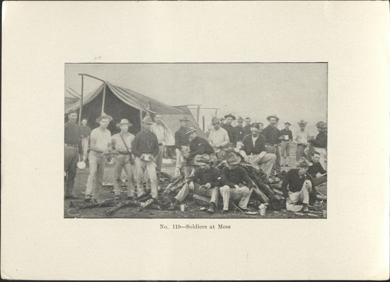 Subject: U.S. soldiers with their mess kits eating a meal outside a tent. Givens was the post photographer at the Presidio of San Francisco starting in 1899. In 1900 he traveled to the Phi