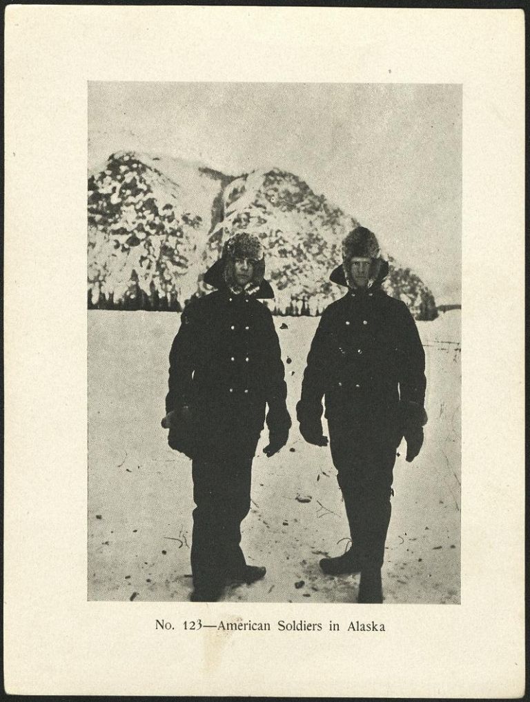 Subject: Two U.S. soldiers wearing cold-weather gear stand amid snow and ice in Alaska.