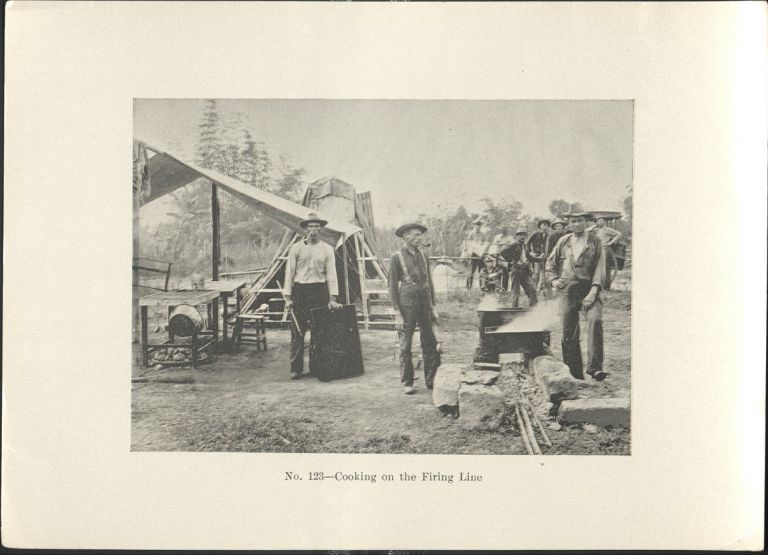 Subject: U.S. soldiers stand around the camp's kitchen, with large kettles boiling over the fire. Givens was the post photographer at the Presidio of San Francisco starting in 1899. In 190
