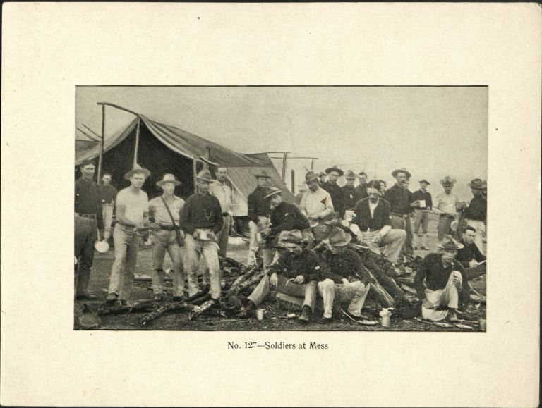 Subject: U.S. soldiers with their mess kits eating a meal outside a tent. Givens was the post photographer at the Presidio of San Francisco starting in 1899. In 1900 he traveled to the Phi