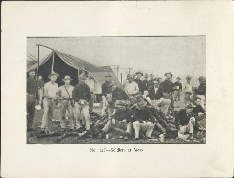 Subject: U.S. soldiers with their mess kits eating a meal outside a tent. Givens was the post photographer at the Presidio of San Francisco starting in 1899. In 1900 he traveled to the Phi